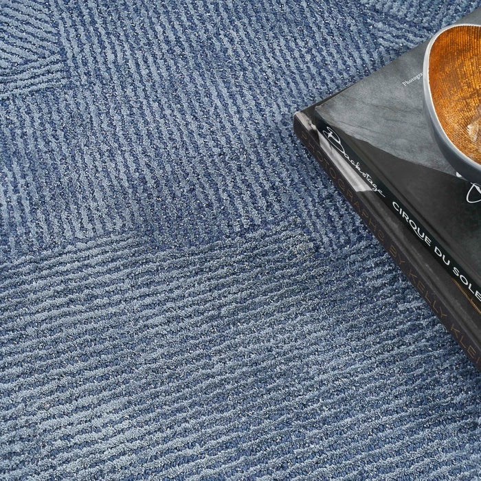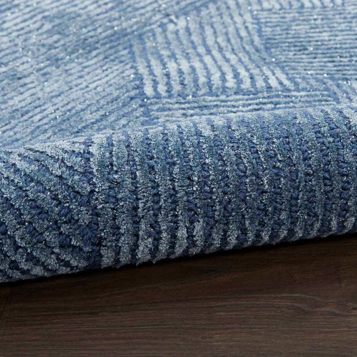 Crafted in bold abstract style, this modern rug from the Michael Amini Star Collection by Nourison is a mesmerizing addition to your home dcor. This statement making design showcases an overlapping linear pattern in deep blue, enhanced by shimmering accents that shift beautifully with changes in light. Handmade in high-low style from a luxurious blend of wool, lurex, and silk-like Luxcelle fibers that feel wonderfully soft underfoot.